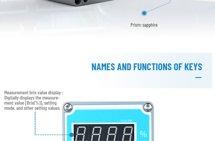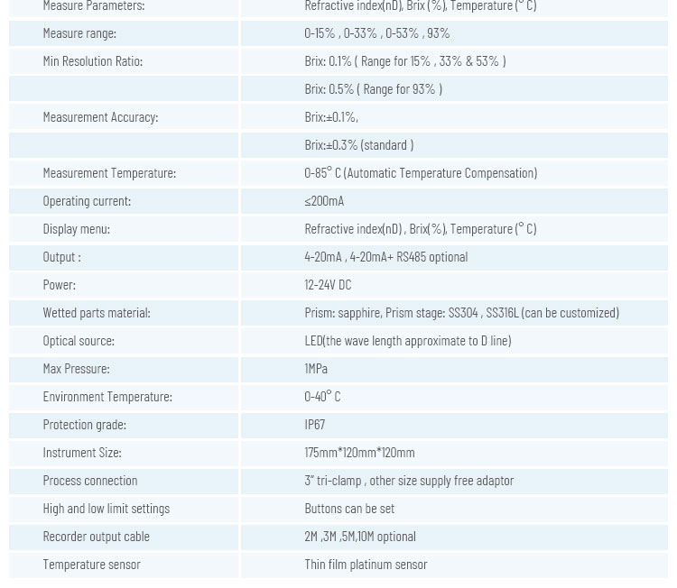 The In-line Brix-Monitor CZ-B is a refractometer that detects the Refractive Index of a sample and outputs , the Brix(%) value on the display , can also transmit measured data to external devices via 4 to 20mA or RS-232C. CZ-B series has the function of automatic temperature compensation according to the temperature of the tested medium , when the tested medium temperature changes , the Brix value ( soluble solids ) after temperature compensation is displays and the output changes accordingly .